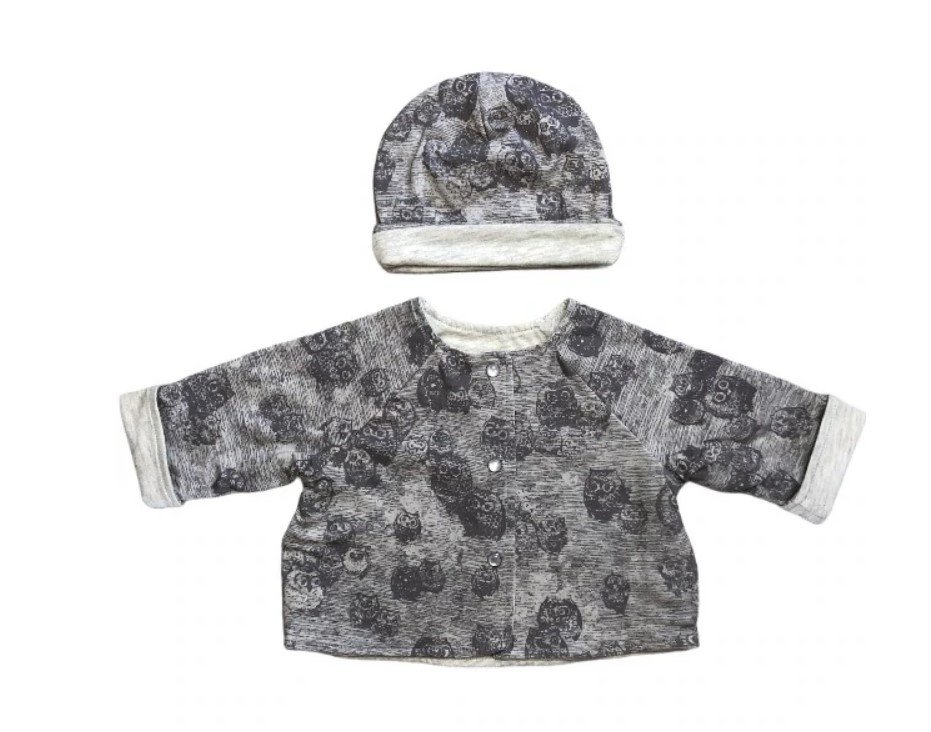 Tuff Kookooshka Studio’s double layered Baby Cardigan featuring a Parliament of Owls in super soft cotton, reversible, with matching beanie.