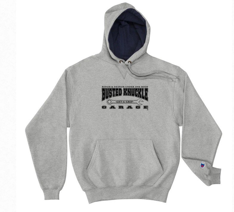 Get A Grip on this Busted Knuckle Garage Car-Guy hoodie by Champion! Available in Exhaust Pipe Gray. The one hoodie to have when you’re under the hood. 100% cotton shell, two-ply hood with a navy colored lining, and the instantly recognizable Champion logo on left sleeve all come together in this soft and durable hoodie that’s made to last (battery acid, uh, uh). Put your hoodie collection in 1s Gear today!
