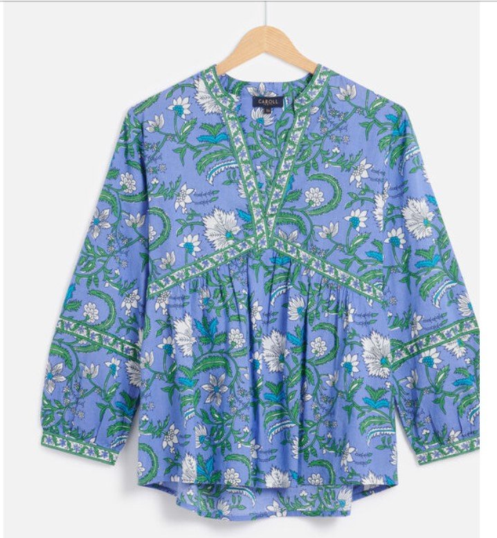 Le top idéal pour l’été, la blouse bibi. Un voile de coton léger, décoré d’un motif floral d’inspiration indienne en camaïeu de bleus ainsi que des détails rehaussés de galons contrastés. Parfait avec un bas écru pour faire ressortir ses couleurs douces, des sandales en cuir et un panier cabas.