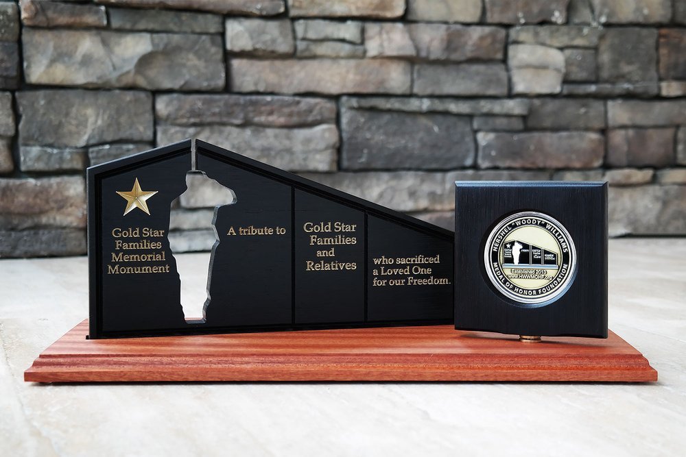 This Monument Coin Display is a representation of the Hershel “Woody” Williams Gold Star Families Memorial Monuments. Its’ purpose is to honor Gold Star Families who have sacrificed a loved one in the service of their country.