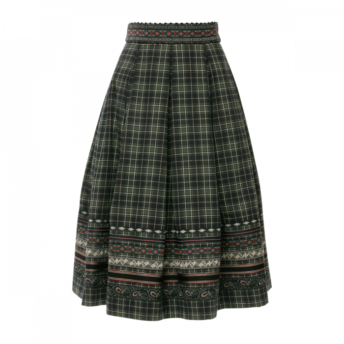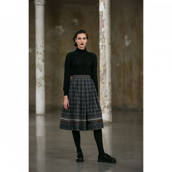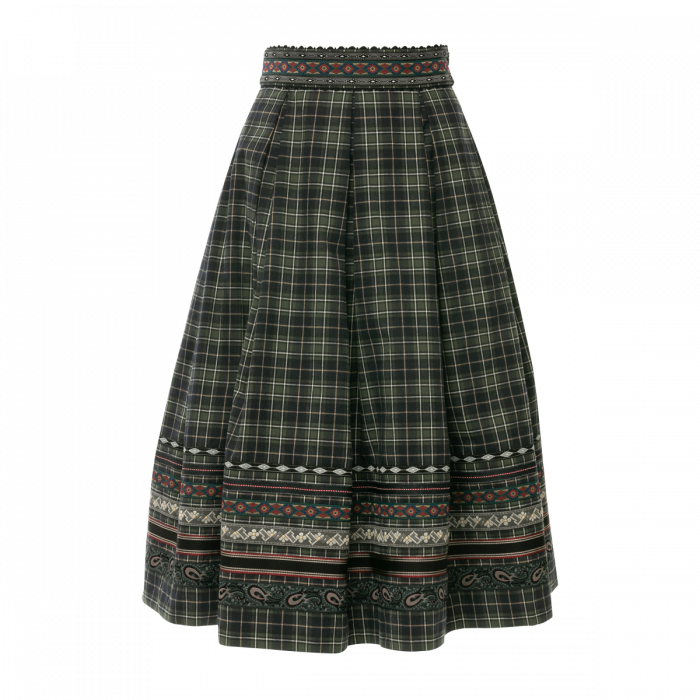 Lena Hoschek Tradition’s “Irmi” skirt is in blue and green plaid flanel. The knee-length skirt has box pleats and decorative ribbons at the hem. A wide ribbon serves as a waistband, creating a shapely silhouette. The skirt closes on the left side with a zipper and two buttons, and has hidden side pockets. Wear it with our “Erika” turtleneck in black.
